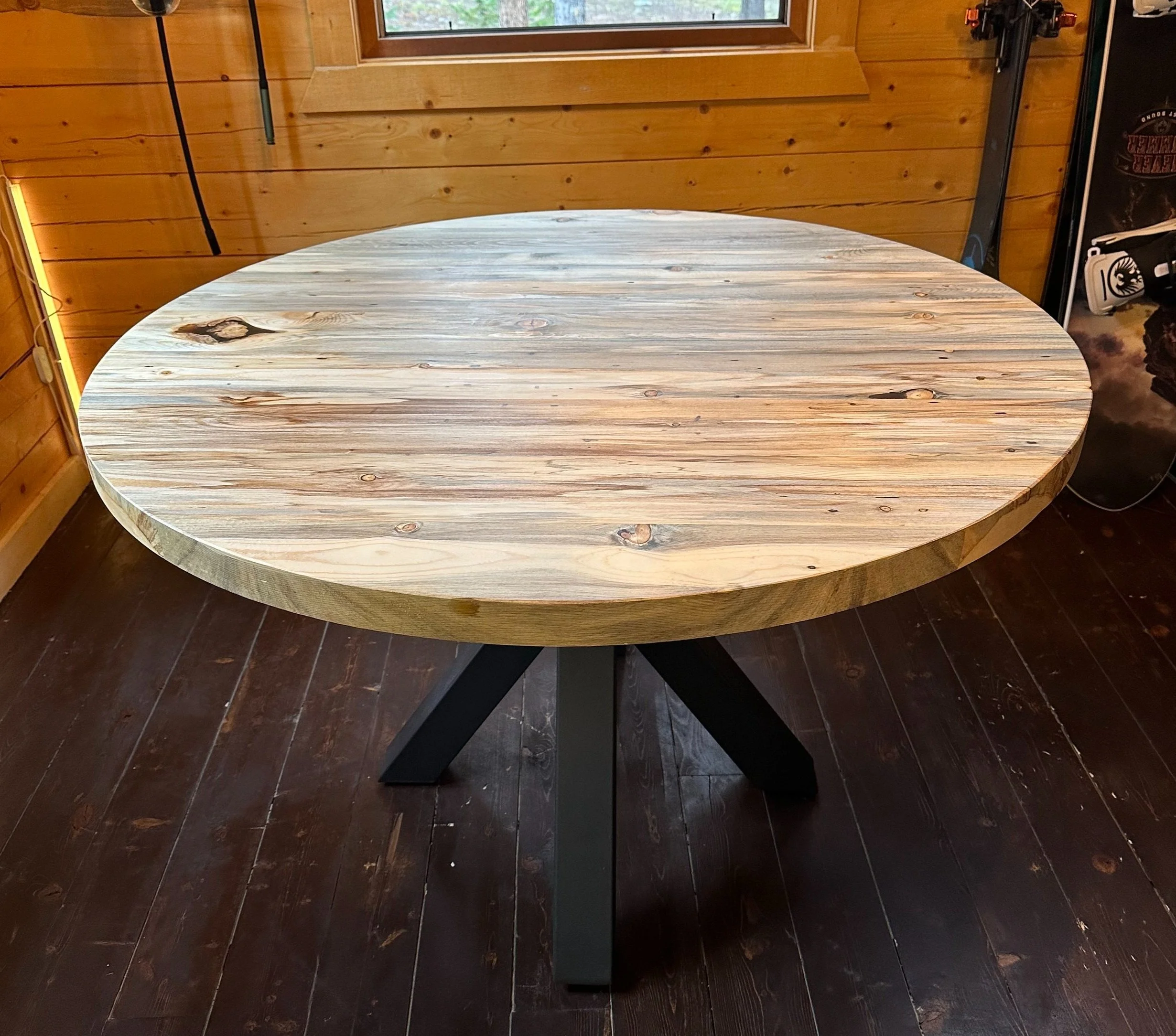 48” round Beetle Kill Pine table with metal pedestal base.