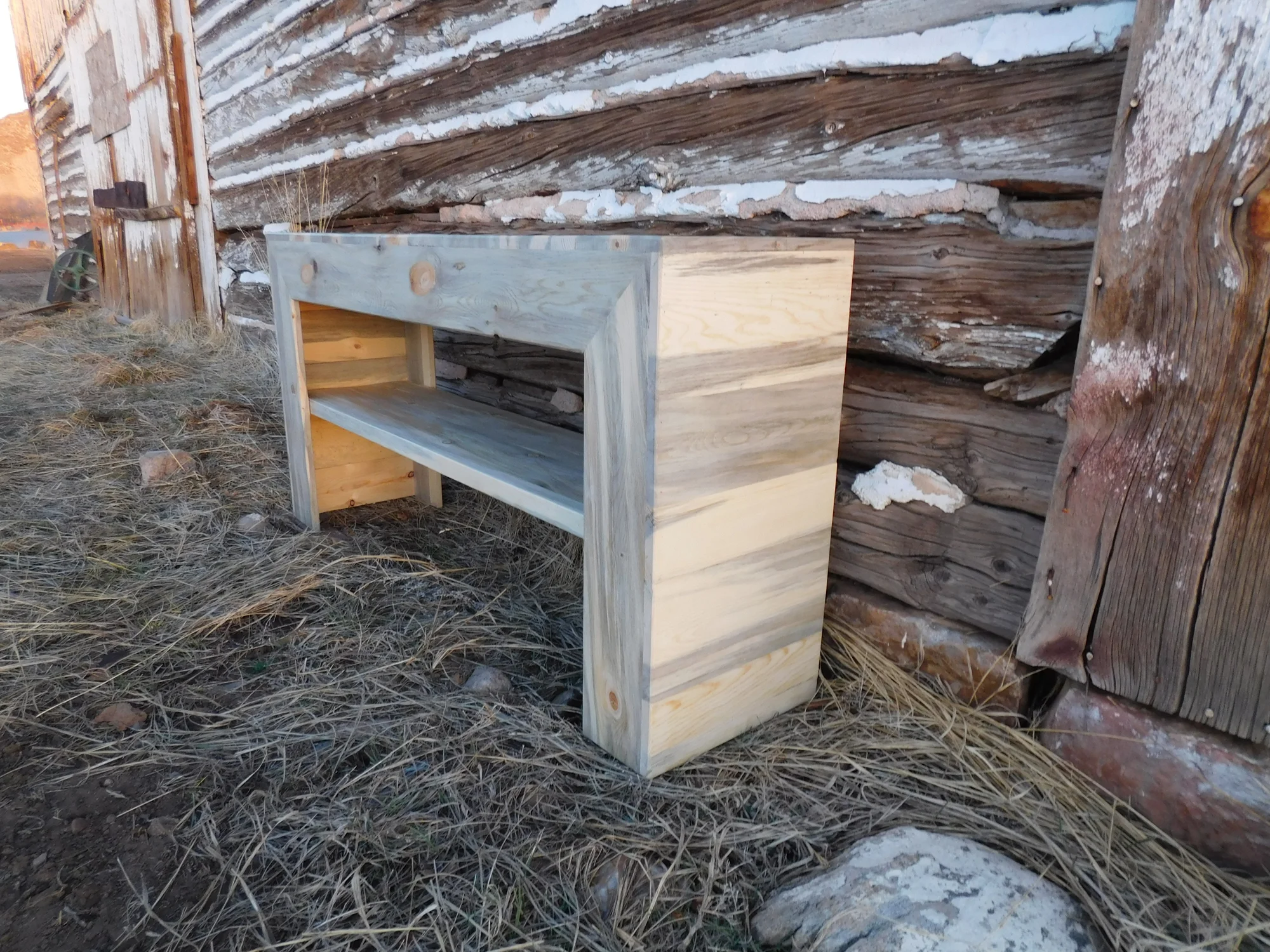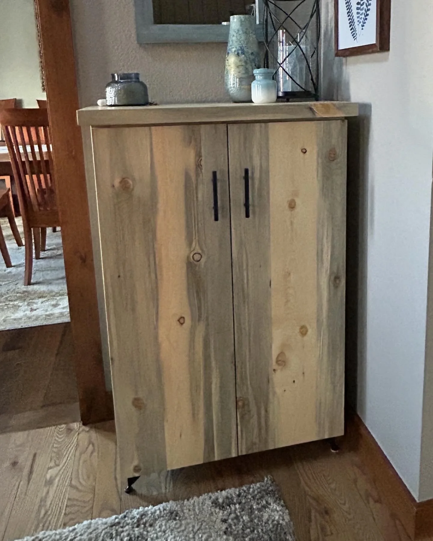 Beetle Kill Pine entry way cabinet with short metal feet.
